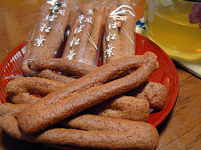 小麦粉、砂糖、玉子、蜂蜜、そば粉を練り松葉の形に整え、オーブンで焼いてます。油を含まない生地はあっさりと軽くサクサクとした歯ごたえの後に口中に広がる蕎麦の香ばしい香り、いくら食べても食べ飽きないお茶受けに最適のお菓子です。